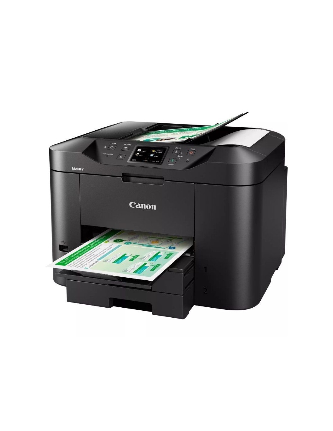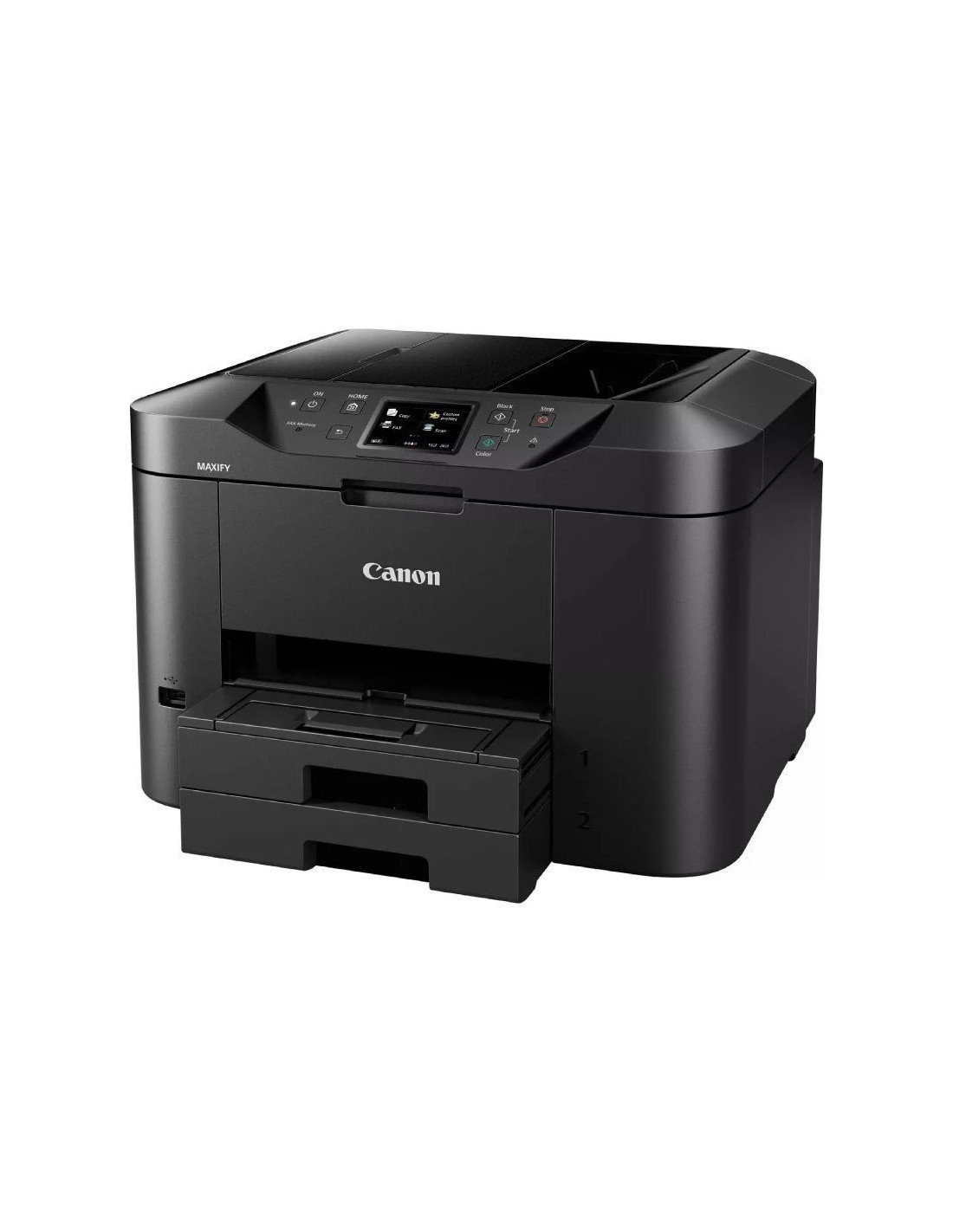 La Canon MAXIFY MB2750 es una impresora multifunción 4 en 1 diseñada para oficinas domésticas y pequeñas empresas que requieren productividad y eficiencia. Con funciones de impresión, copia, escaneo y fax, este equipo ofrece una velocidad de impresión de hasta 24 ipm en monocromo y 15,5 ipm en color. Su capacidad de entrada de papel de 500 hojas y el alimentador automático de documentos (ADF) de 50 hojas permiten manejar grandes volúmenes de trabajo sin interrupciones. Además, cuenta con conectividad Wi-Fi, Ethernet y compatibilidad con servicios en la nube, facilitando la impresión y el escaneo desde dispositivos móviles y plataformas en línea.